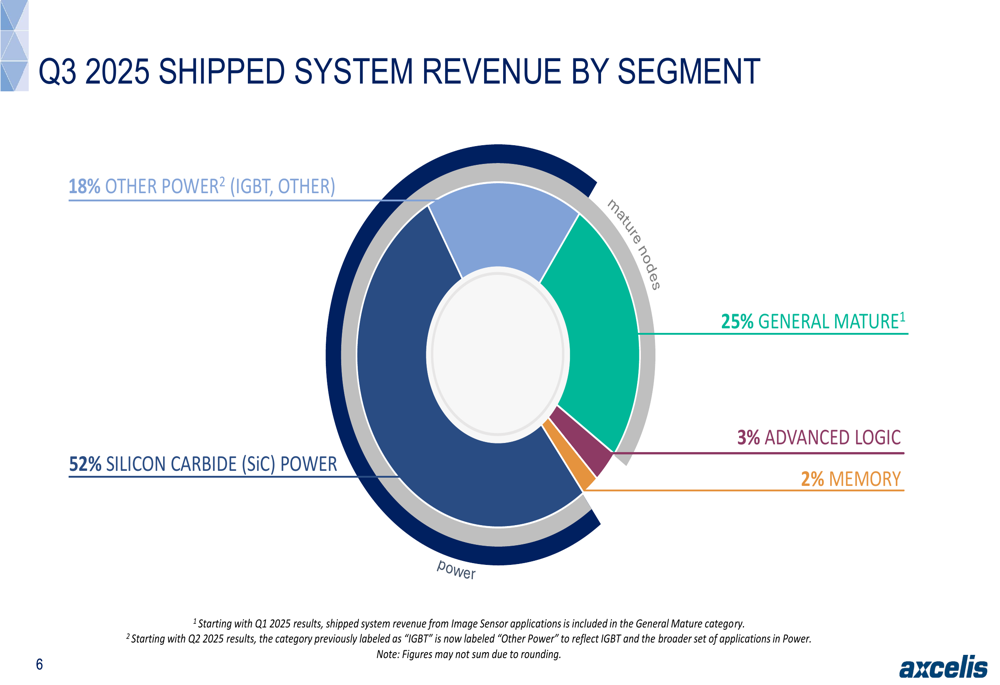 Silicon Carbide power applications dominated Axcelis’ shipped system revenue in Q3, accounting for 52% of the total. This reflects the company’s strong positioning in the growing market for silicon carbide semiconductor devices, which are increasingly used in electric vehicles and other power applications.