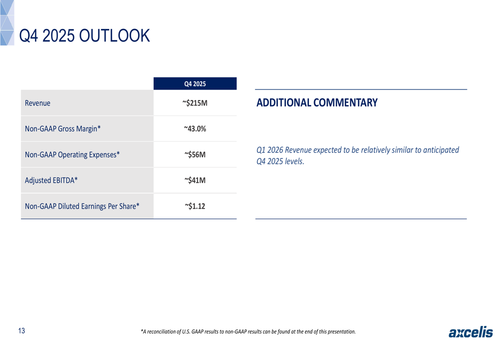 Looking ahead, Axcelis provided guidance for the fourth quarter of 2025, projecting revenue of approximately $215 million and non-GAAP diluted earnings per share of around $1.12. The company also indicated that Q1 2026 revenue is expected to remain relatively similar to Q4 2025 levels.