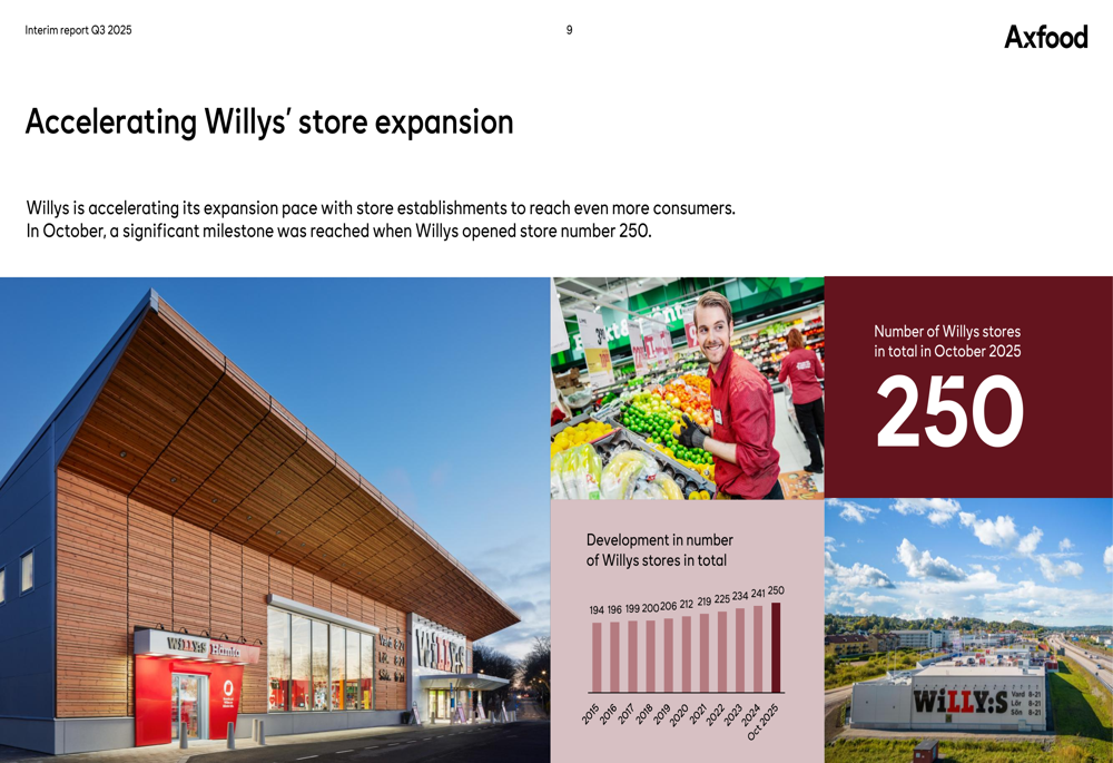 Willys, Axfood's largest segment, delivered a 6.2% increase in net sales to SEK 12,076 million, with like-for-like sales growth of 4.1%. The segment's operating profit rose 5.5% to SEK 587 million, maintaining an operating margin of 4.9%. Willys reached a milestone of 250 stores in October 2025, reflecting the company's accelerated expansion pace.