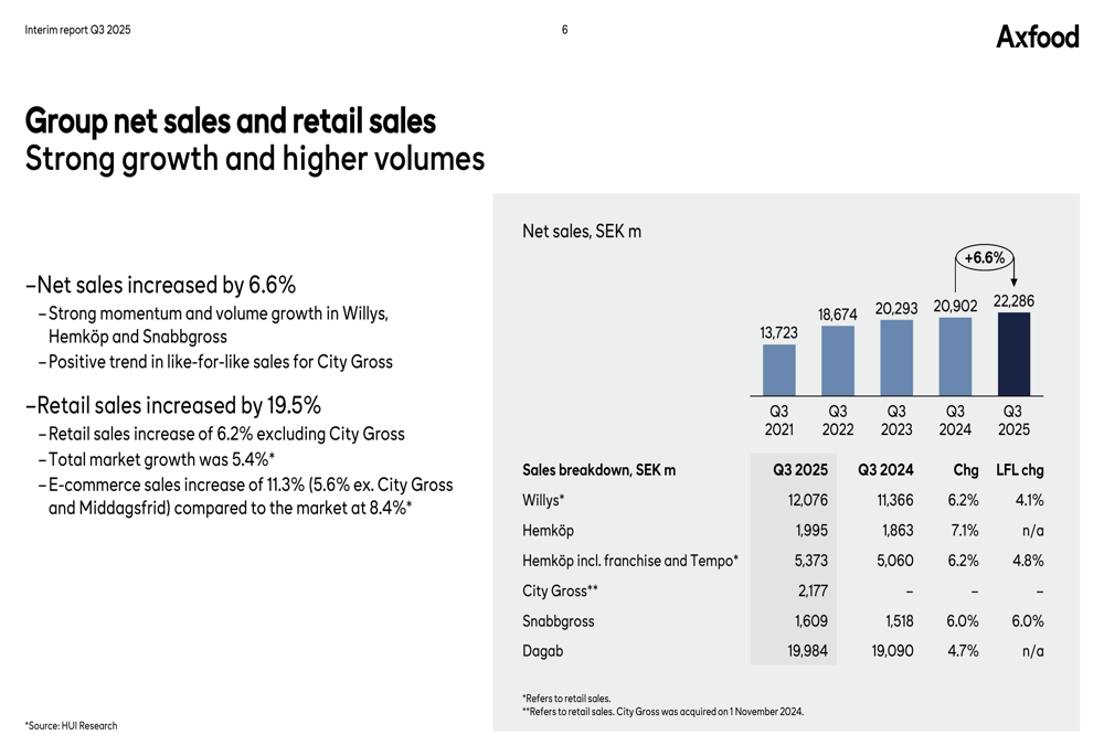 Axfood reported Q3 2025 net sales of SEK 22,286 million, representing a 6.6% increase from the previous year. The adjusted operating profit rose to SEK 1,099 million from SEK 1,007 million in Q3 2024, with adjusted operating margin improving slightly to 4.9% from 4.8%.