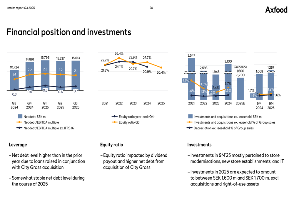 Axfood maintained a strong financial position with robust cash flow from operating activities of SEK 1,352 million in Q3 2025, up from SEK 1,013 million in Q3 2024. The company's leverage, equity ratio, and investments reflect its strategic focus on growth and efficiency: