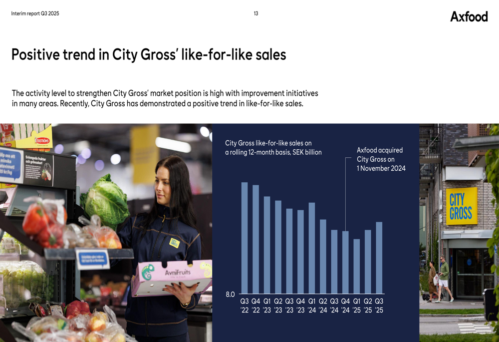 City Gross, which Axfood acquired recently, showed signs of improvement with like-for-like sales growth of 3.2%, though it still operated at a loss with an adjusted operating margin of -0.2%. The company continues to implement improvement initiatives to strengthen City Gross's market position.