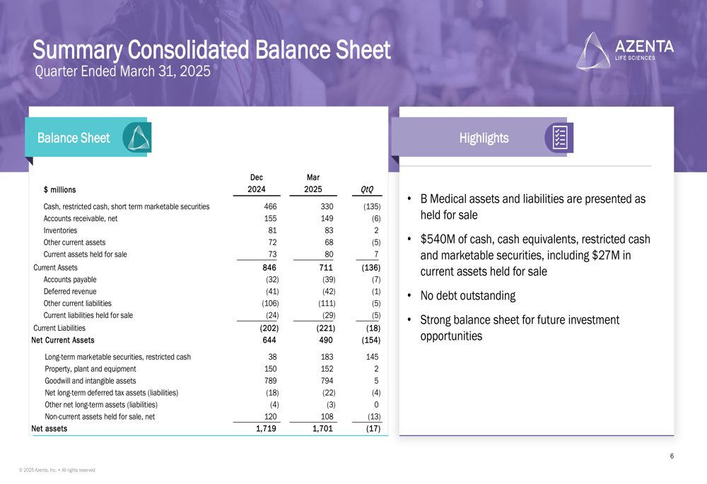 The consolidated balance sheet showed total current assets of $711 million and net current assets of $490 million as of March 31, 2025. B Medical assets and liabilities are presented as held for sale, consistent with the company’s previously announced strategic decision to divest this business unit.