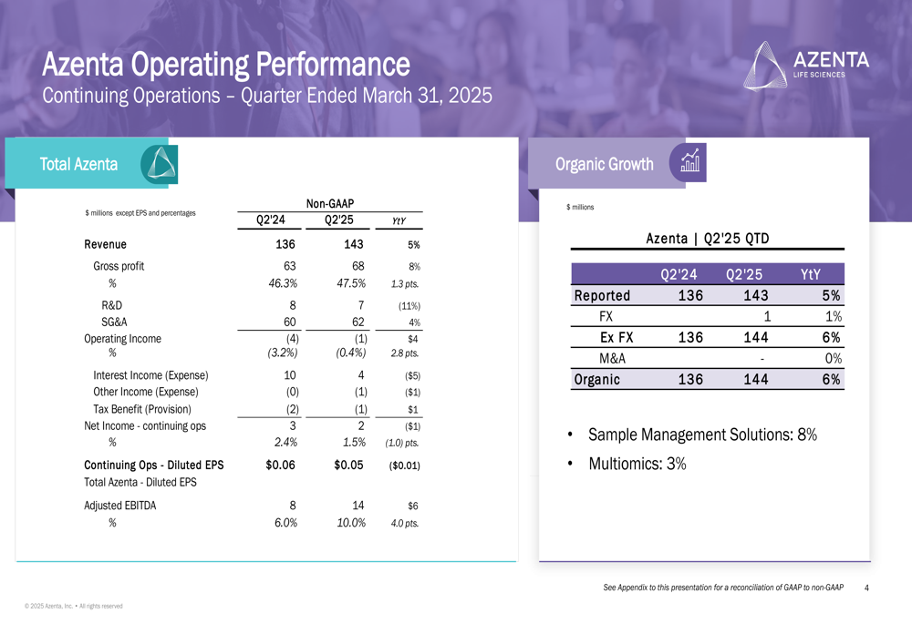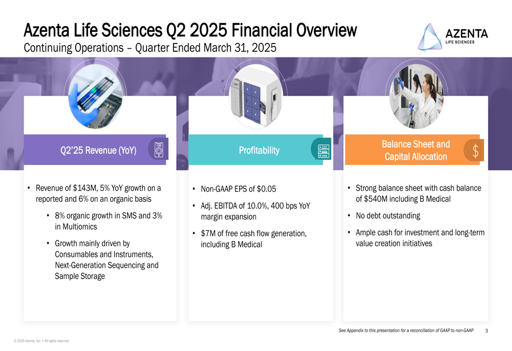 Azenta reported Q2 2025 revenue of $143 million, representing 5% year-over-year growth on a reported basis and 6% on an organic basis. The company achieved a non-GAAP EPS of $0.05 and an adjusted EBITDA margin of 10.0%, marking a substantial 400 basis points year-over-year expansion.