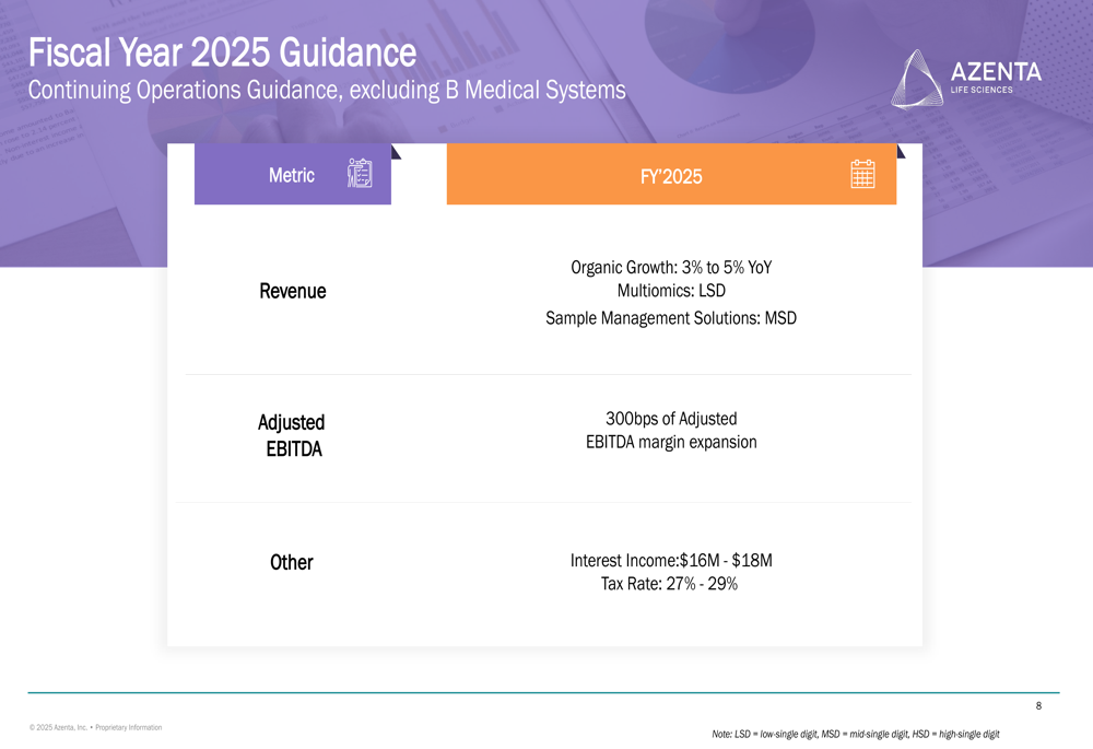 Looking ahead, Azenta provided fiscal year 2025 guidance that excludes B Medical Systems. The company projects organic revenue growth of 3% to 5% year-over-year, with Multiomics expected to deliver low-single-digit growth and Sample Management Solutions anticipated to achieve mid-single-digit growth.
