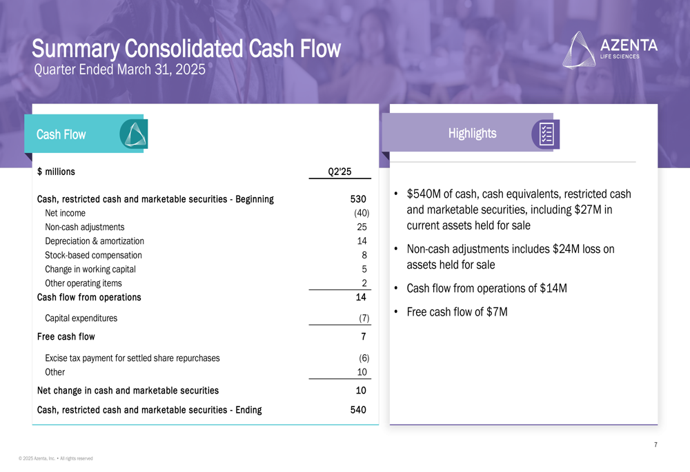 Azenta maintained a strong financial position with $540 million in cash (including B Medical (TASE:BLWV) assets), and no debt outstanding. The company generated $7 million in free cash flow during the quarter, including contributions from B Medical, which is being prepared for divestiture as announced in previous quarters.