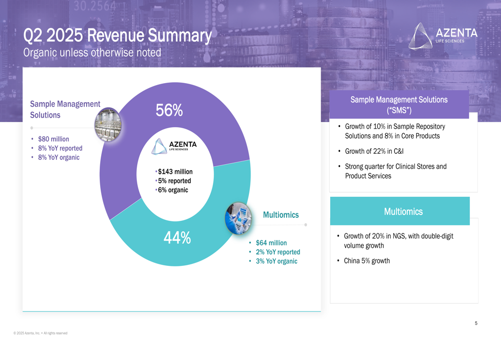 Sample Management Solutions (SMS) emerged as the stronger performer, accounting for 56% of total revenue at $80 million. This segment achieved 8% year-over-year growth on both a reported and organic basis, driven primarily by consumables, instruments, and sample storage services.