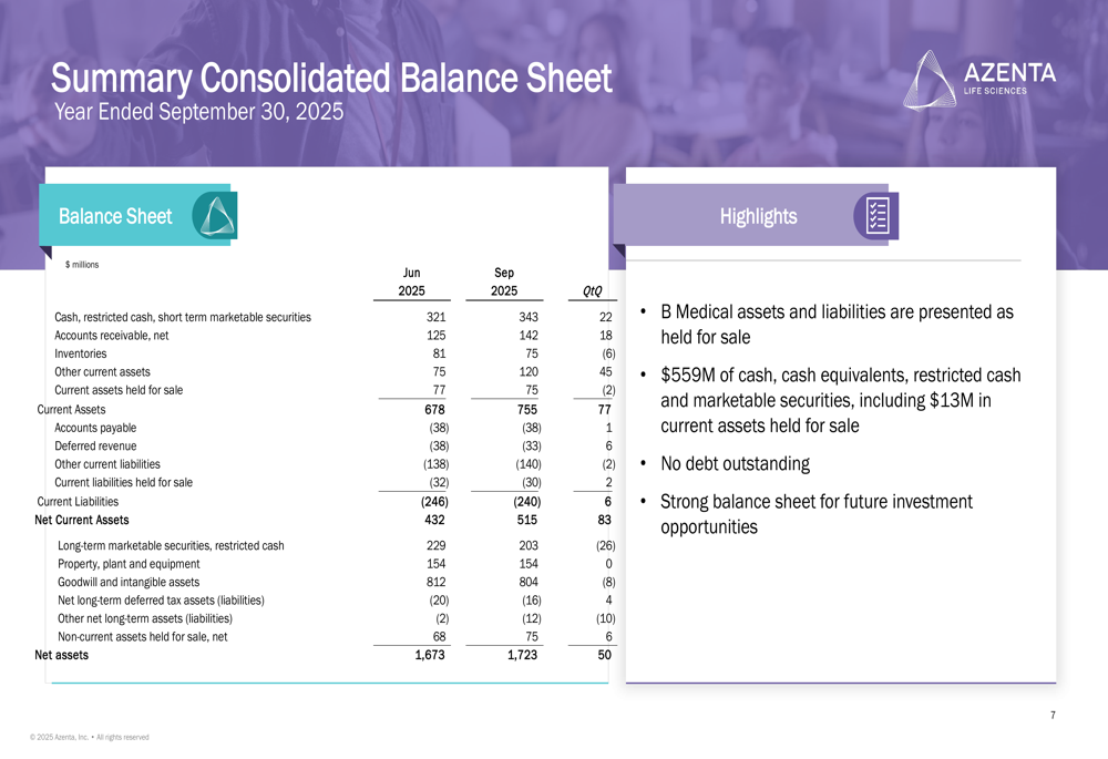 Azenta maintains a robust balance sheet with $546 million in cash and no outstanding debt, providing significant flexibility for future investments and strategic initiatives. This strong financial position supports the company’s long-term growth strategy and potential merger and acquisition activities.