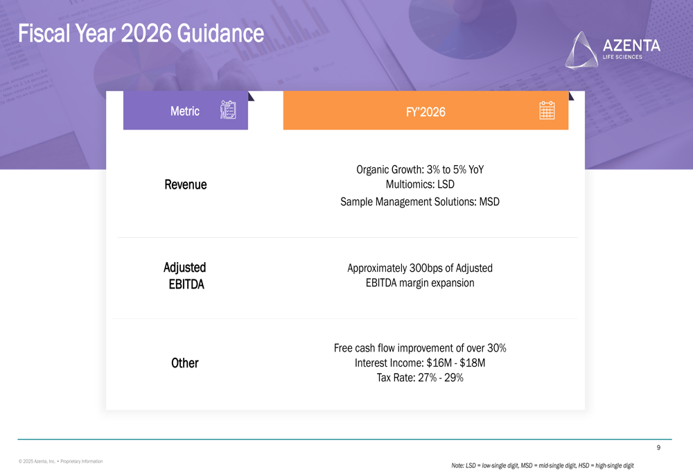 As shown in the following guidance slide, Azenta also projects interest income of $16-18 million and a tax rate of 27-29% for fiscal 2026: