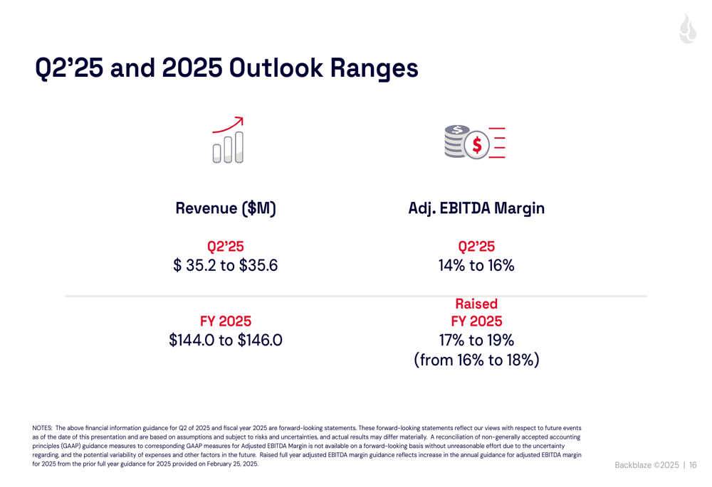 Based on its strong Q1 performance, Backblaze raised its full-year guidance. For Q2 2025, the company expects revenue between $35.2 million and $35.6 million, with adjusted EBITDA margin of 14% to 16%. For the full year 2025, revenue guidance stands at $144.0 million to $146.0 million, while adjusted EBITDA margin guidance was raised from 16-18% to 17-19%.