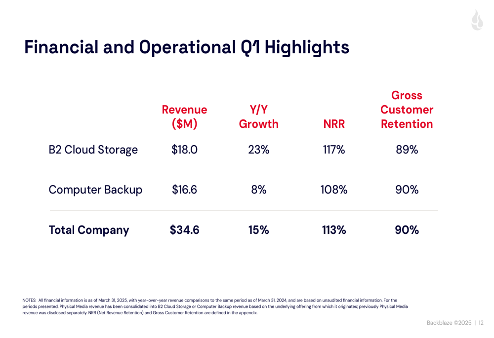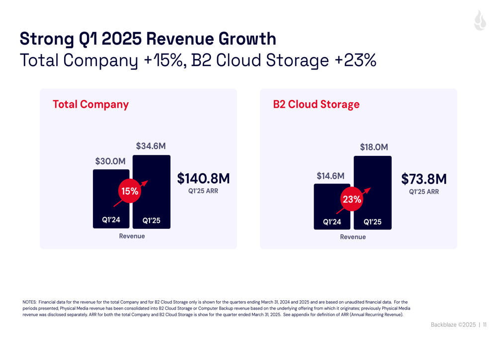 Backblaze reported total revenue of $34.6 million for Q1 2025, representing 15% year-over-year growth and exceeding analyst expectations of $34.22 million. The company’s B2 Cloud Storage segment was the standout performer, growing 23% year-over-year to reach $18.0 million, accelerating from 22% growth in the previous quarter.