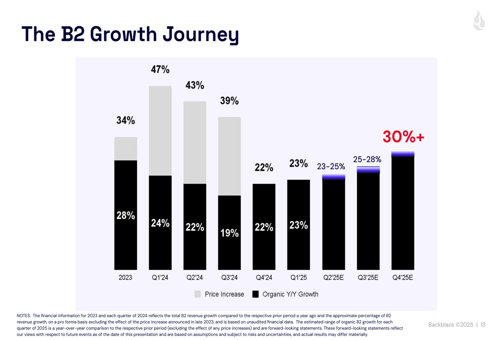 The B2 Cloud Storage segment is expected to maintain its growth trajectory throughout 2025, with organic year-over-year growth projected to reach 30%+ by Q4 2025:
