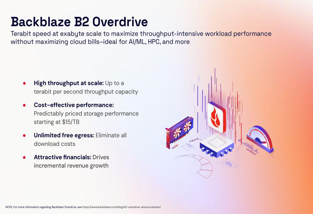 To capitalize on this growth, Backblaze announced a new offering called "B2 Overdrive," designed specifically for throughput-intensive workloads like AI/ML and high-performance computing. The service promises terabit-speed performance at exabyte scale with predictable pricing starting at $15/TB and unlimited free egress—a direct challenge to the egress fees charged by major cloud providers.
