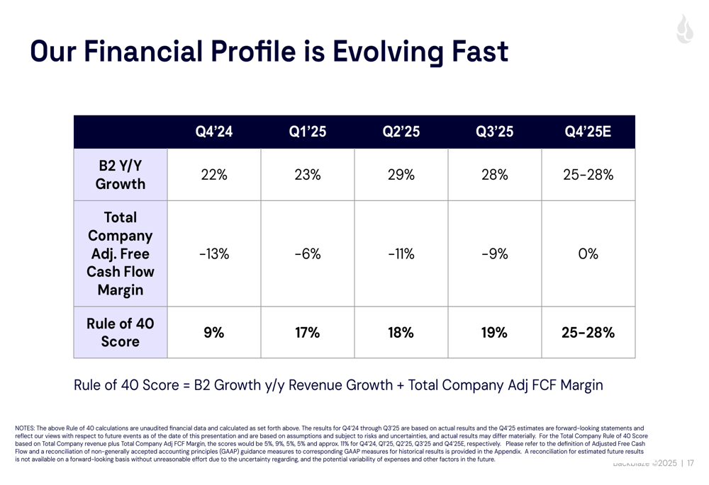 The Rule of 40 Score (combining B2 growth and adjusted free cash flow margin) has improved from 9% in Q4 2024 to 19% in Q3 2025, with expectations of reaching 25-28% in Q4 2025.