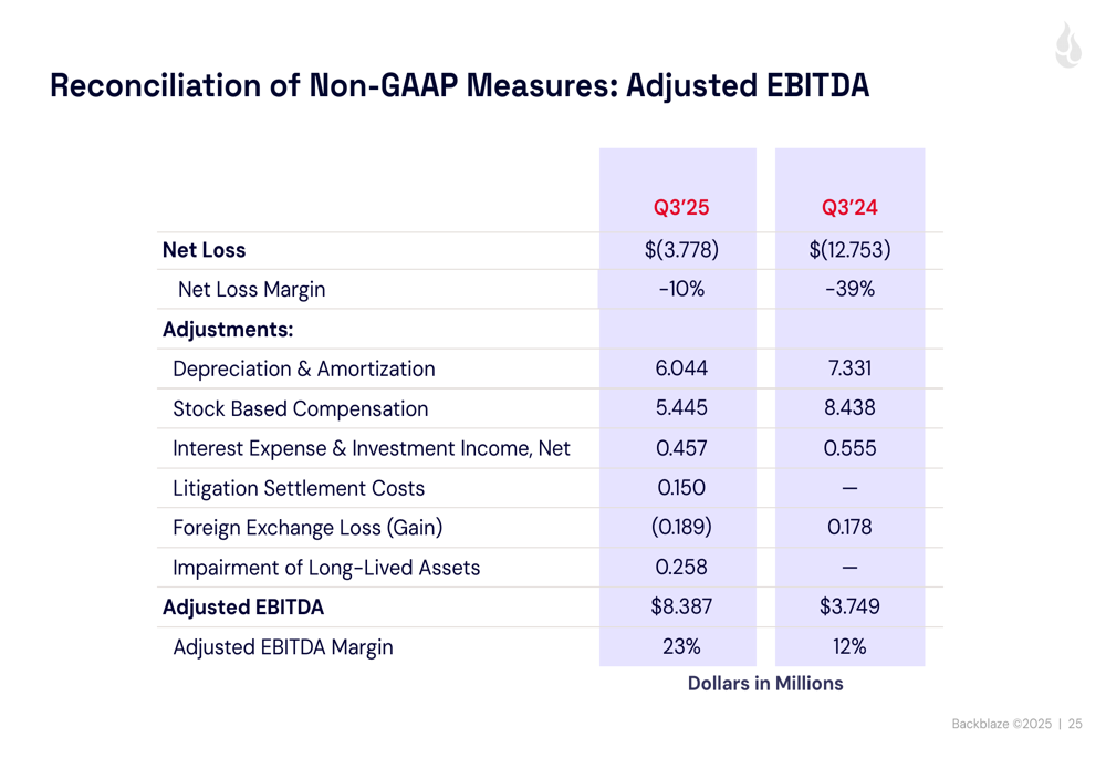 GAAP net loss improved to $3.778 million from $12.753 million in the year-ago quarter, while adjusted EBITDA nearly doubled to $8.387 million (23% margin) from $3.749 million (12% margin) in Q3 2024.