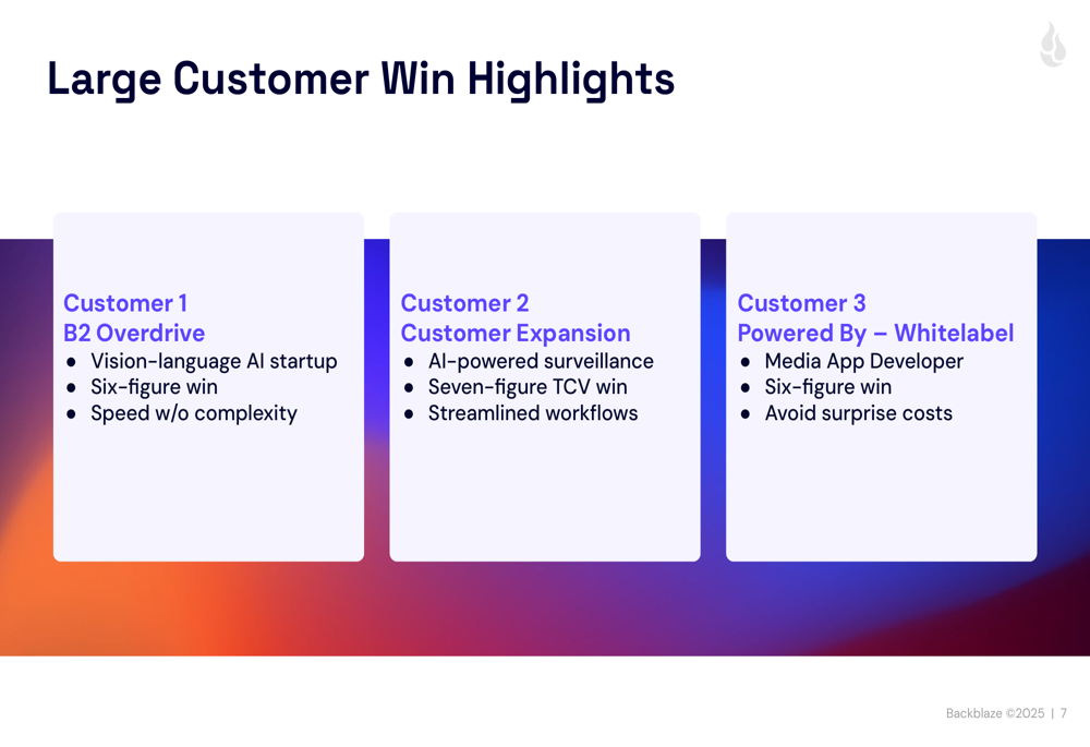 These customer examples highlight Backblaze's ability to win six and seven-figure deals across various sectors, including AI startups, surveillance applications, and media development.