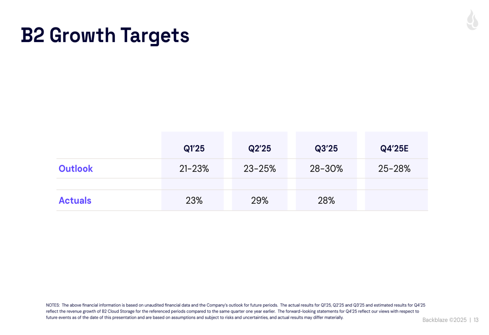 After exceeding growth targets in Q2 2025 (29% actual vs. 23-25% outlook), B2 growth came in at the low end of the outlook range in Q3 2025 (28% actual vs. 28-30% outlook). For Q4 2025, Backblaze expects B2 growth of 25-28%.