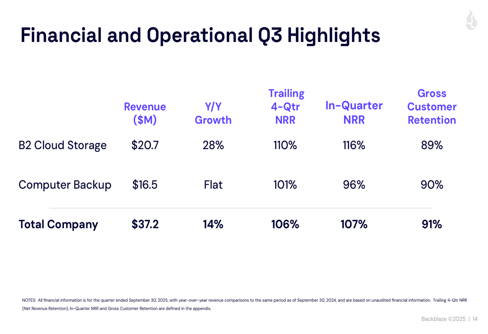 The company's B2 Cloud Storage revenue reached $20.7 million, growing 28% year-over-year with a trailing four-quarter net revenue retention (NRR) of 110%. Meanwhile, Computer Backup revenue remained flat at $16.5 million. Total gross customer retention across the business stood at a healthy 91%.