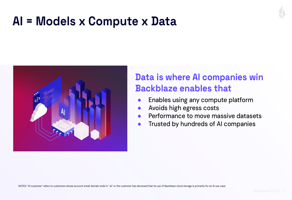 Management highlighted that Backblaze enables AI companies to use any compute platform while avoiding high egress costs typically associated with larger cloud providers. The company noted that its solutions are already trusted by hundreds of AI companies, with AI-related storage now accounting for approximately 25% of new business.