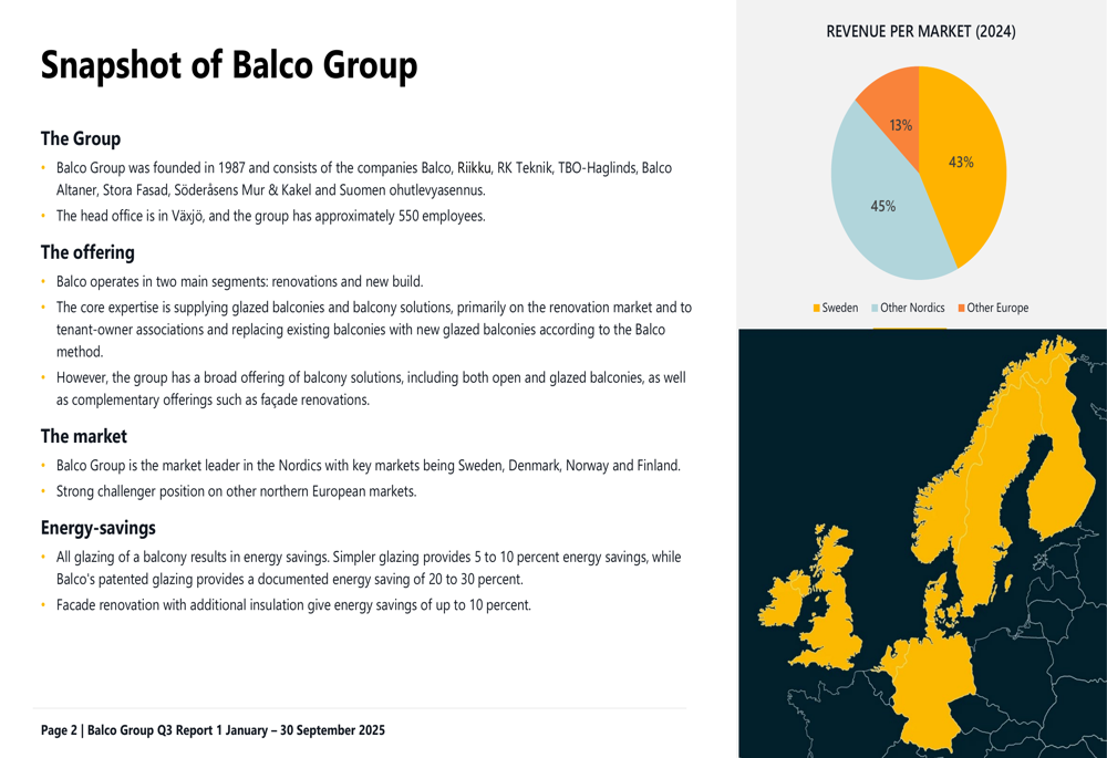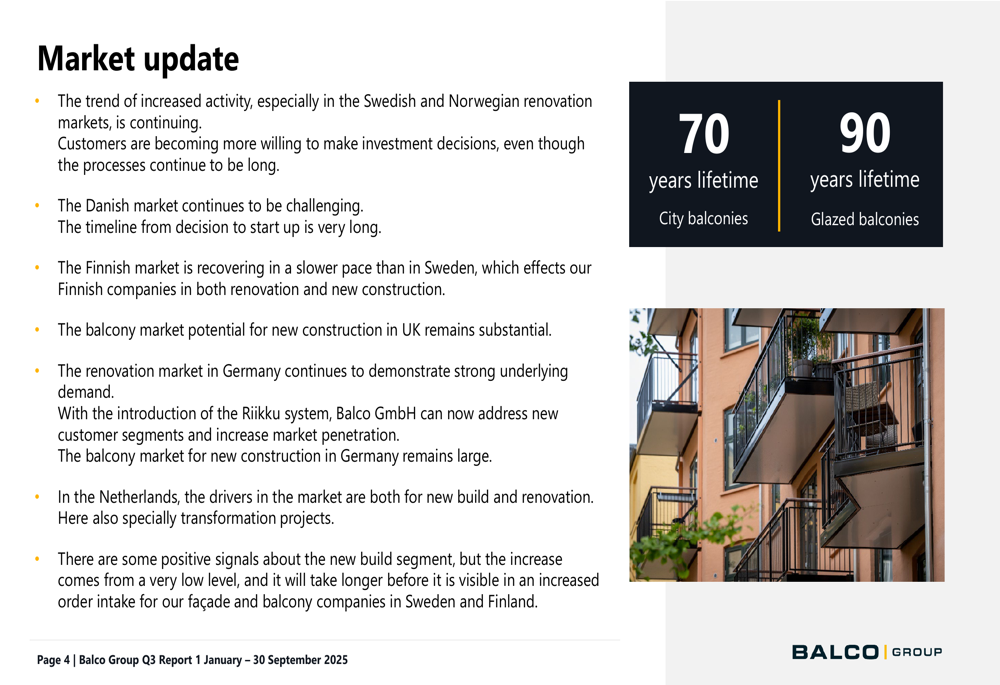 Despite current financial challenges, Balco continues to pursue geographic expansion. The company secured its first orders in Germany using glazing systems from its Riikku brand and won a contract for balconies for a social housing project in the Netherlands. Management sees substantial potential in the UK balcony market and strong demand in the German renovation sector.