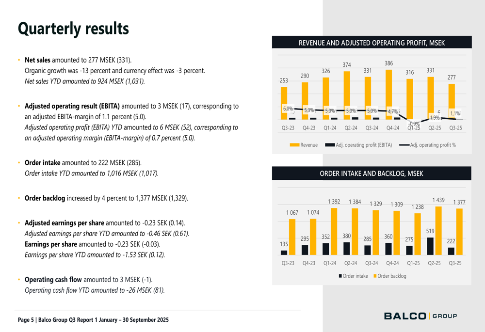 Balco reported net sales of 277 MSEK for Q3 2025, representing a 16.3% decline compared to the same period last year. The company’s organic growth was negative at -13%, while adjusted operating profit (EBITA) fell sharply to 3 MSEK, corresponding to a margin of just 1.1% - down from 5.0% in the previous year.