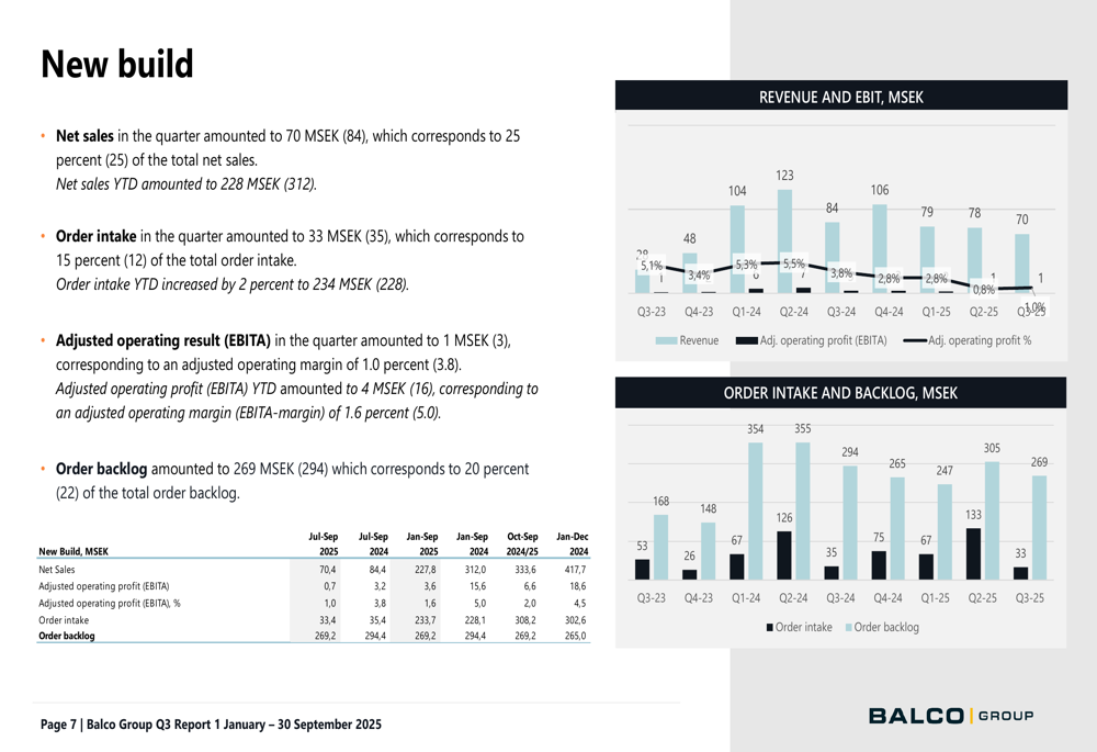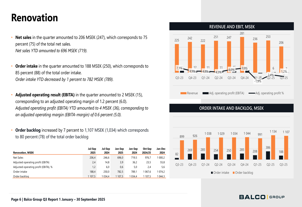 Balco’s business is divided into two main segments: renovation and new build. The renovation segment, which constitutes the company’s core business, generated 206 MSEK in net sales during Q3, representing 75% of total revenue. This segment received 188 MSEK in new orders (85% of total order intake) and maintained an order backlog of 1,107 MSEK, up 7% year-over-year.