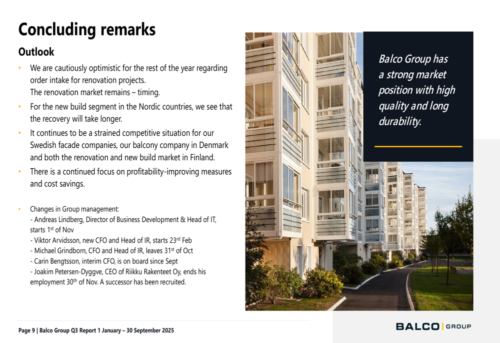 Looking ahead, Balco management remains "cautiously optimistic" about order intake for renovation projects for the rest of the year, while acknowledging that the new build segment in Nordic countries faces a longer recovery timeline. The company continues to focus on profitability-improving measures and cost savings.