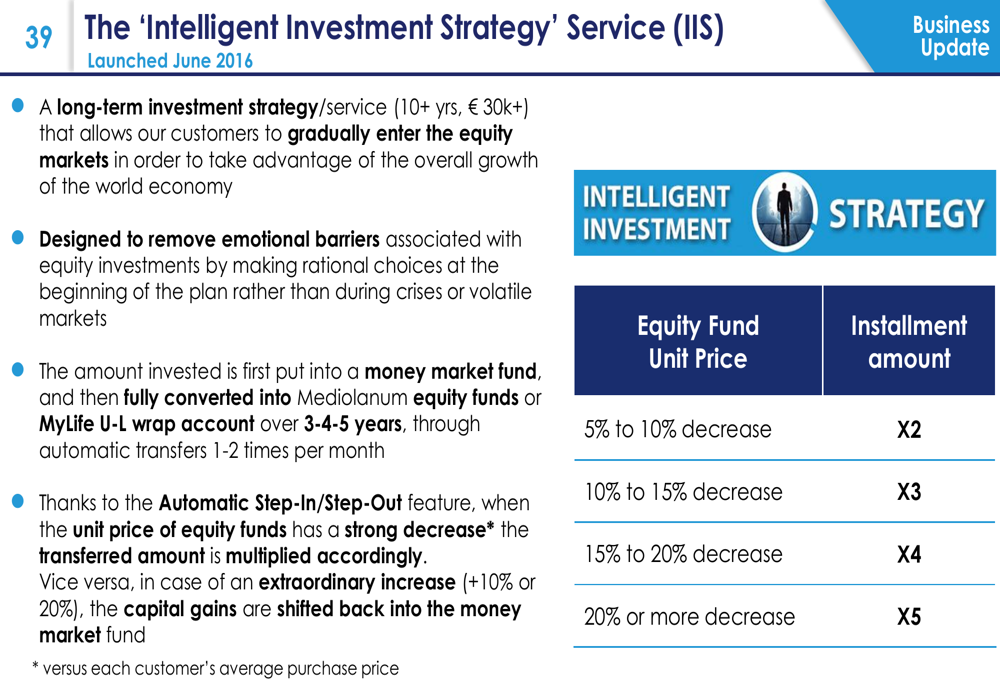 The IIS service employs a sophisticated approach to gradual market entry, automatically increasing investment amounts during market downturns: