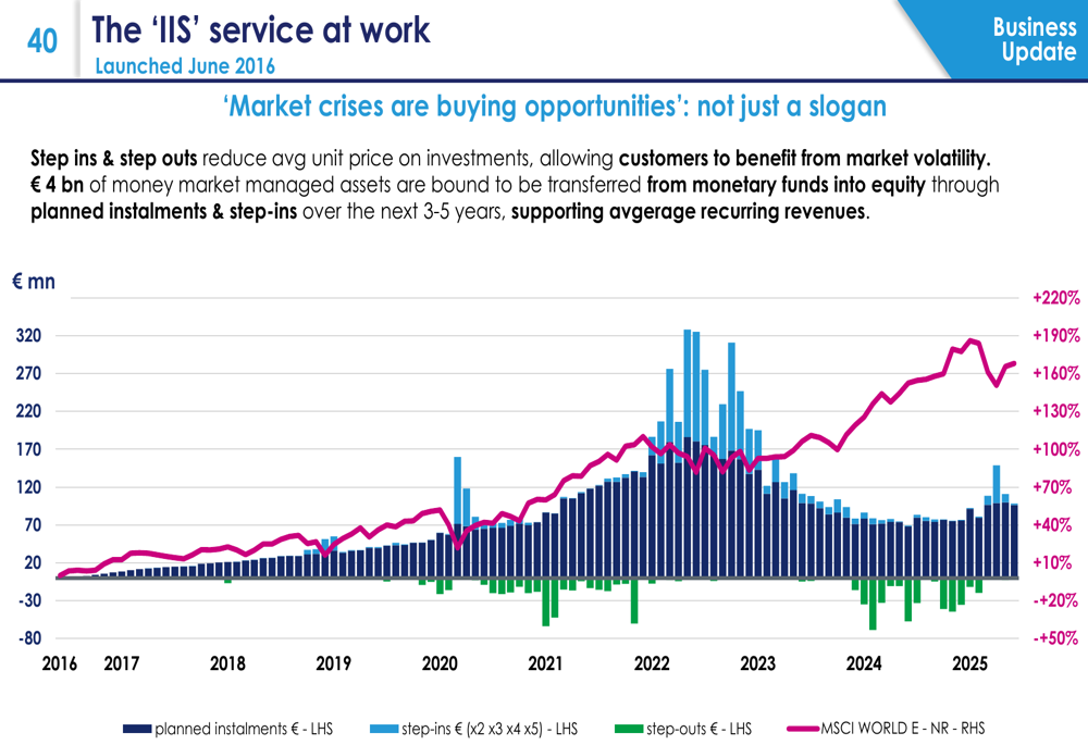 Banca Mediolanum highlighted several strategic initiatives driving its growth and resilience. The bank’s automatic investment services, including the Intelligent Investment Strategy (IIS), continue to attract significant inflows, with money market AUM increasing by 41% to €4.03 billion since the end of 2024.
