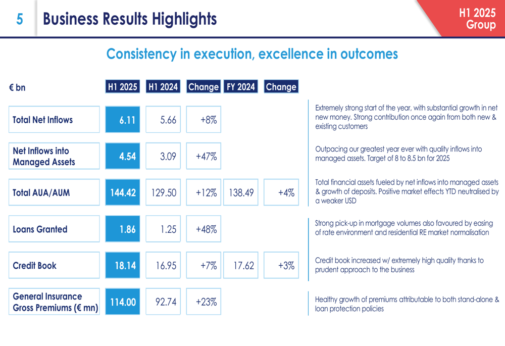 Total net inflows reached €6.11 billion, up 8% year-over-year, with net inflows into managed assets surging by 47% to €4.54 billion. Total assets under administration and management grew by 12% to €144.42 billion. The bank also reported strong growth in lending, with loans granted increasing by 48% to €1.86 billion, driven particularly by a 75% jump in mortgage volumes.