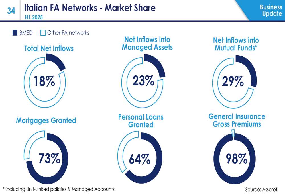 The bank also maintains a strong competitive position in the Italian financial advisor network market, with significant market share across various product categories: