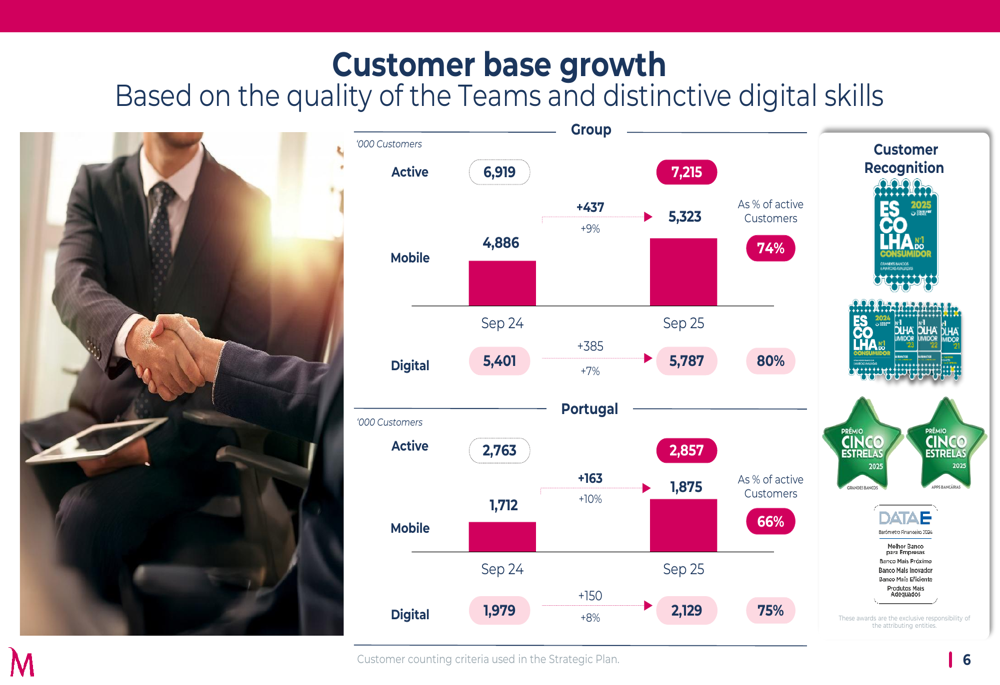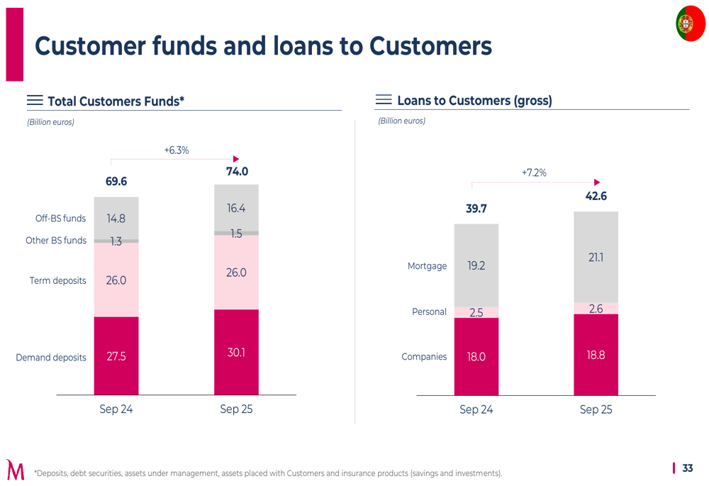 Customer funds in Portugal grew by 6.3% to €74.0 billion, while loans to customers increased by 7.2% to €42.6 billion. Performing loans showed even stronger growth of 8.0%, reaching €41.8 billion, with the mortgage loan portfolio expanding by €1.9 billion: