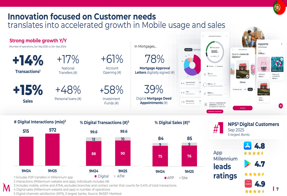 BCP’s digital transformation continues to accelerate, with mobile customers increasing by 9% year-over-year to 5.3 million, now representing 74% of active customers. In Portugal, mobile customers grew by 10% to 1.9 million, accounting for 66% of active customers: