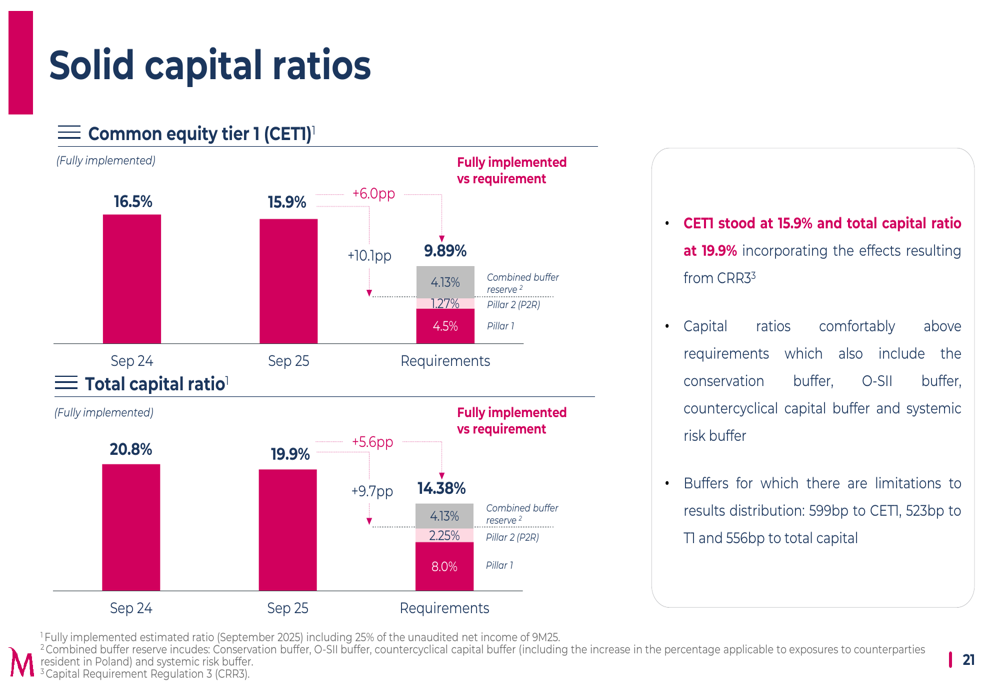 BCP maintained a strong capital position with a CET1 ratio of 15.9% and a total capital ratio of 19.9%, both significantly above regulatory requirements. These capital buffers provide the bank with financial flexibility and stability: