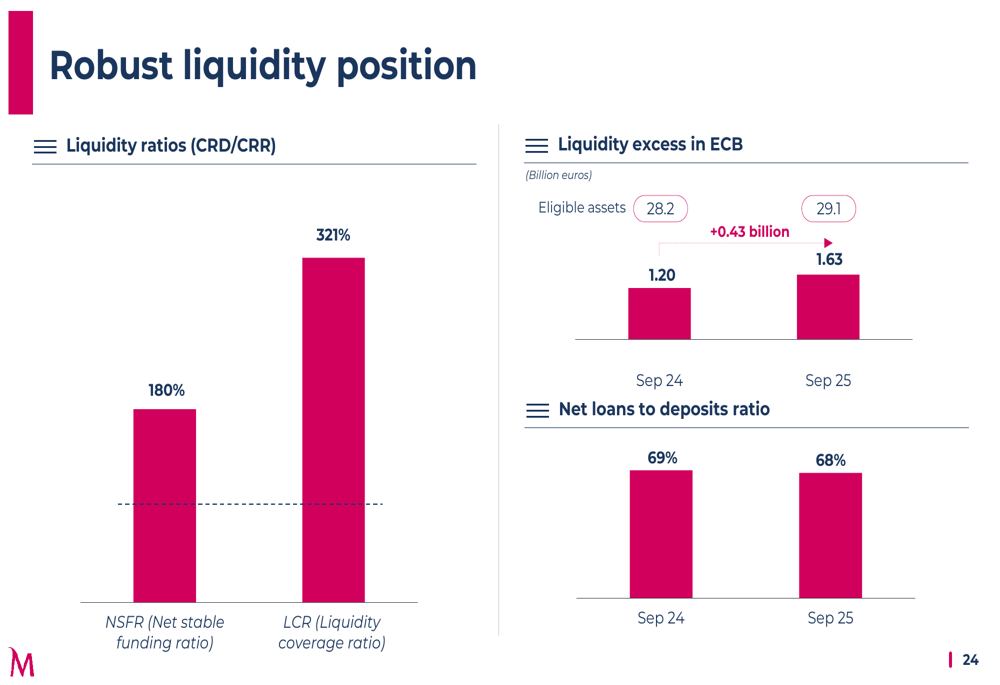 The bank’s liquidity position remains robust, with a Liquidity Coverage Ratio (LCR) of 321% and a Net Stable Funding Ratio (NSFR) of 180%, well above regulatory minimums. The bank has €29.1 billion in eligible assets with the European Central Bank:
