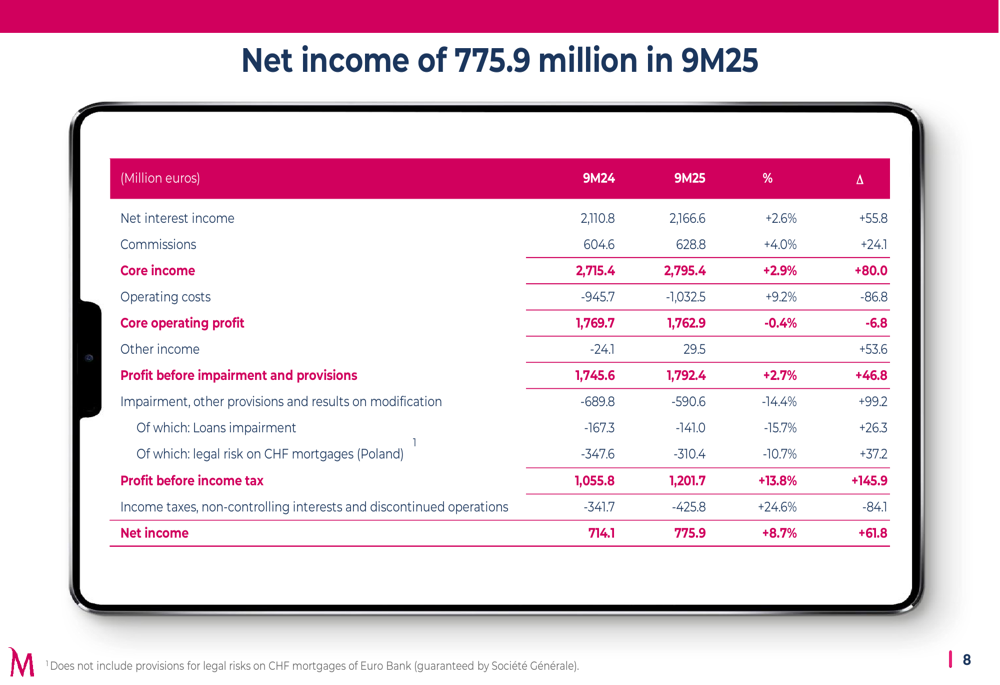 Bank Millennium reported a 2.2% increase in net income to €554.4 million, with net operating revenue growing by 7.8% to €1,220.2 million. The bank continues to manage its Swiss franc mortgage portfolio, which has decreased by 34% to €1.1 billion: