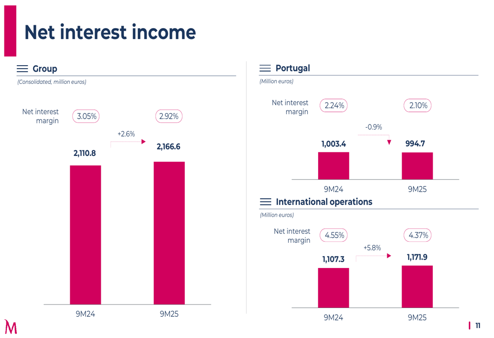 Net interest income performance varied by region, with the international operations growing by 5.8% to €1,171.9 million, offsetting a slight 0.9% decline in Portugal to €994.7 million. The group’s net interest margin decreased slightly from 3.05% to 2.92%:
