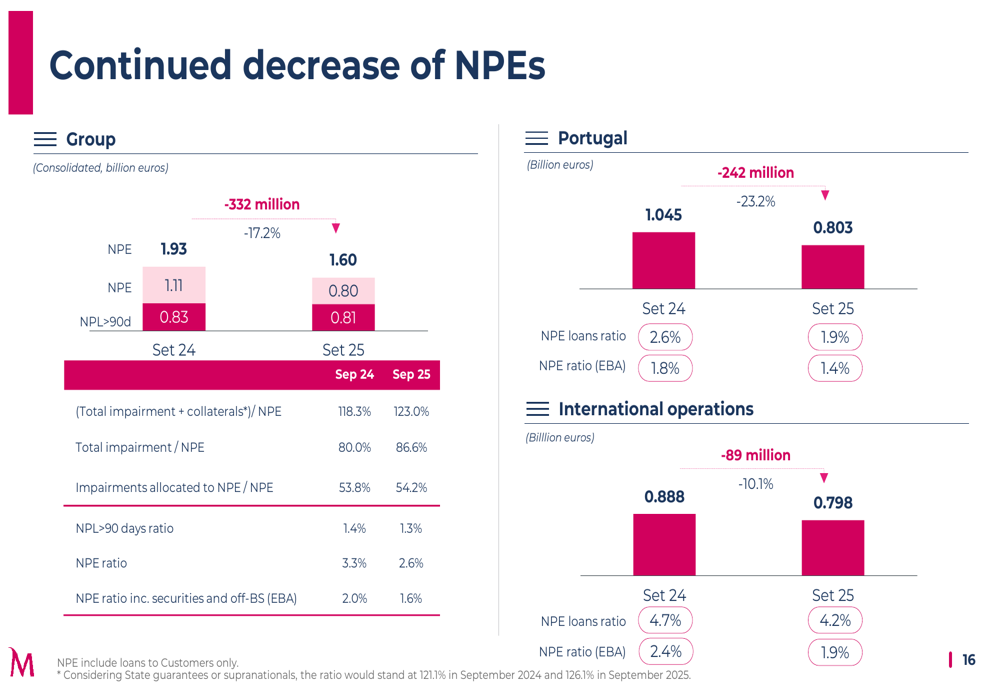Asset quality continued to improve, with non-performing exposures (NPEs) decreasing by 17.2% year-over-year to €1.60 billion. In Portugal, NPEs declined by 23.2% to €0.803 billion, resulting in an NPE ratio of 1.4% (EBA definition):