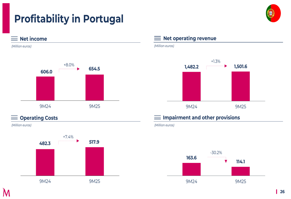 The Portuguese operation delivered strong results with net income increasing by 8.0% to €654.5 million. Net operating revenue grew by 1.3% to €1,501.6 million, while impairment and provisions decreased significantly by 30.2% to €114.1 million: