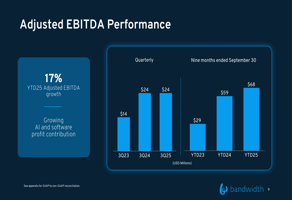 While quarterly revenue showed strong growth, Bandwidth’s adjusted EBITDA for Q3 2025 remained flat year-over-year at $24 million. However, on a year-to-date basis, adjusted EBITDA reached $68 million, representing a 17% increase over the same period in 2024.