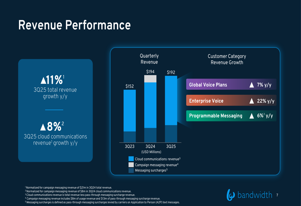 Bandwidth delivered total revenue of $192 million for Q3 2025, representing an 11% year-over-year increase and exceeding analyst expectations of $189.91 million. However, the company posted earnings per share of $0.36, missing the forecasted $0.37.