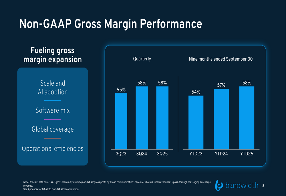 Bandwidth emphasized its growing focus on artificial intelligence throughout its presentation. The company noted that AI voice usage is increasing among its customers and that AI adoption is contributing to gross margin expansion.