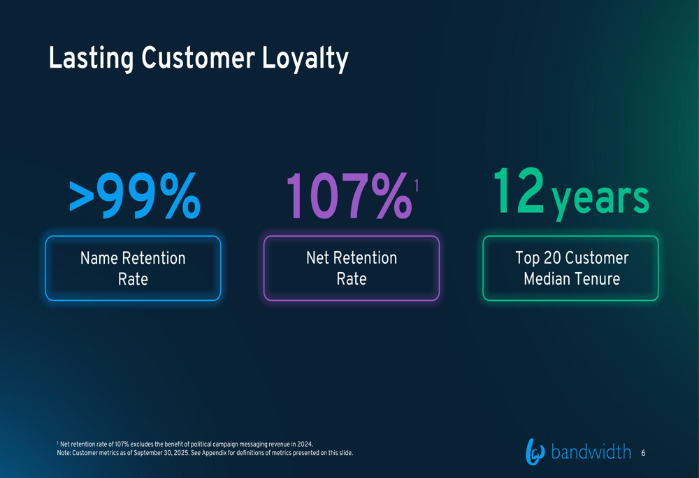 Bandwidth highlighted its strong customer relationships as a key business strength. The company maintains impressive retention metrics, including a name retention rate exceeding 99% and a net retention rate of 107% (excluding political campaign benefits).