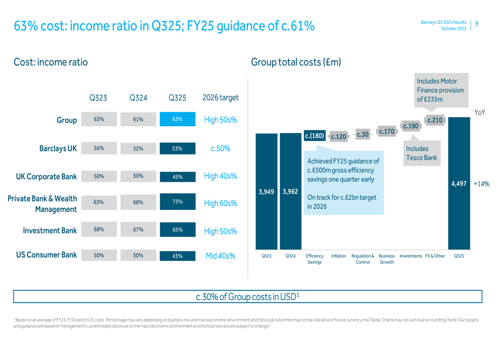 On the cost side, Barclays reported a cost-to-income ratio of 63% for Q3 2025, unchanged from Q3 2023 but up slightly from 61% in Q3 2024. The bank has already achieved its full-year 2025 gross cost efficiency savings target of approximately £500 million by the end of Q3: