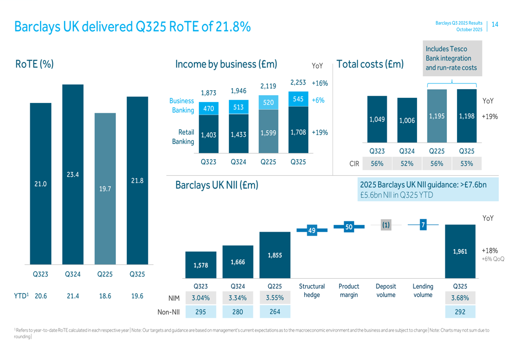 Barclays UK delivered strong results with a 21.8% RoTE for Q3 2025, driven by an 18% year-over-year increase in Net Interest Income to £2.0 billion. The division’s income grew by 21% to £2.3 billion, while profit before tax increased by 11% to £1.0 billion: