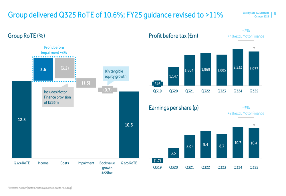 Barclays reported a statutory RoTE of 10.6% for Q3 2025, down from 12.3% in Q3 2024, though the year-to-date figure remains strong at 12.3%. The bank’s CET1 ratio improved to 14.1%, up from 13.8% in September 2024, reflecting a strengthened capital position.