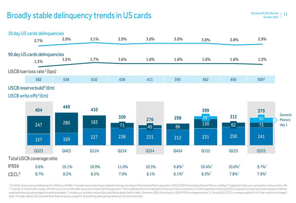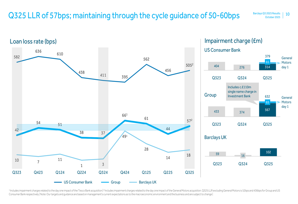 Credit quality remains within expectations, with a loan loss rate of 57bps for Q3 2025, within the bank’s through-the-cycle guidance of 50-60bps. The impairment charge increased to £632 million, partly due to day one impacts from the General Motors and Tesco Bank acquisitions: