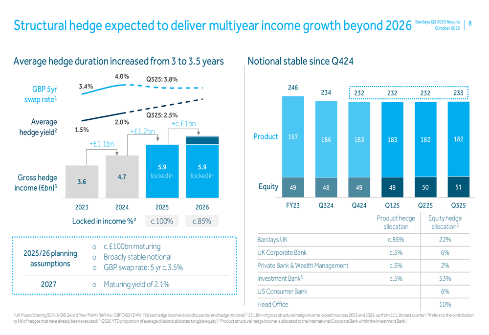 The structural hedge continues to be a significant contributor to income stability, with an average hedge yield of 1.5% and locked-in income for 2025 and 2026. The bank has increased its average hedge duration from 3 to 3.5 years, providing greater visibility on future income: