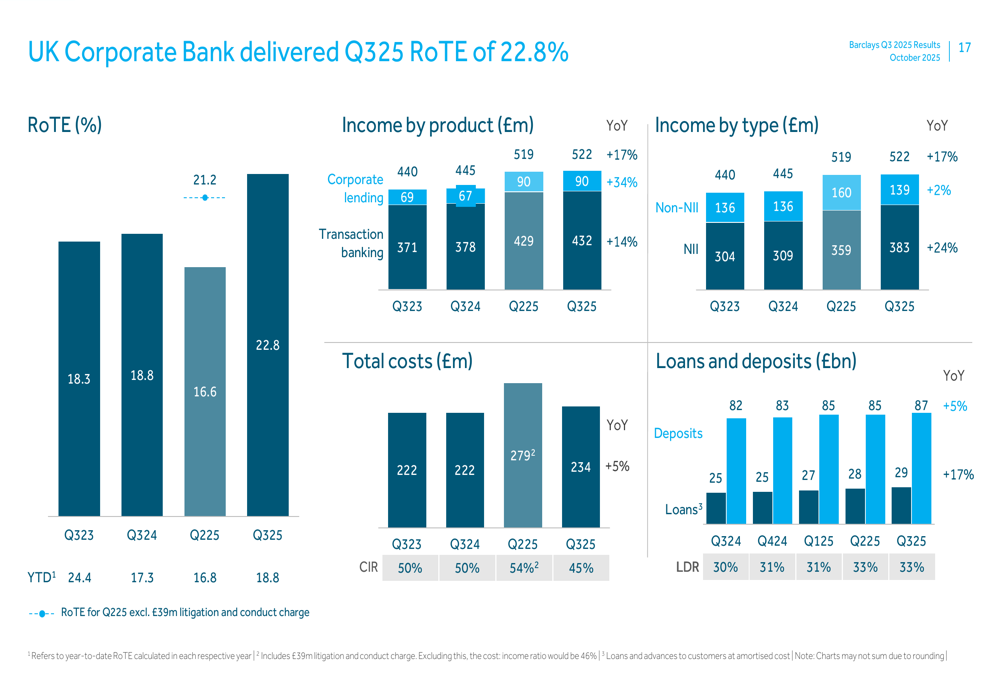 The UK Corporate Bank also performed well, with a 22.8% RoTE for Q3 2025. The division saw strong growth in both deposits (up 5% year-over-year) and loans (up 17% year-over-year):