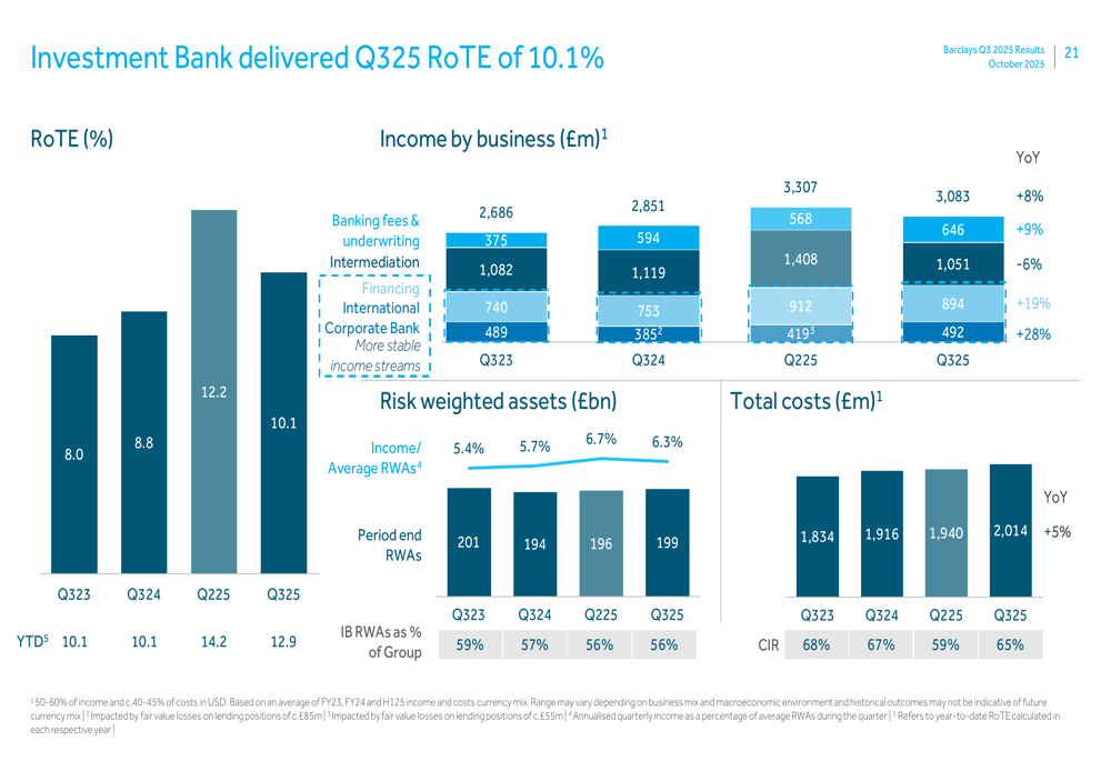 The Investment Bank delivered a more moderate performance with a 10.1% RoTE for Q3 2025, though its year-to-date RoTE remains strong at 12.9%. The division’s income breakdown shows varied performance across business lines: